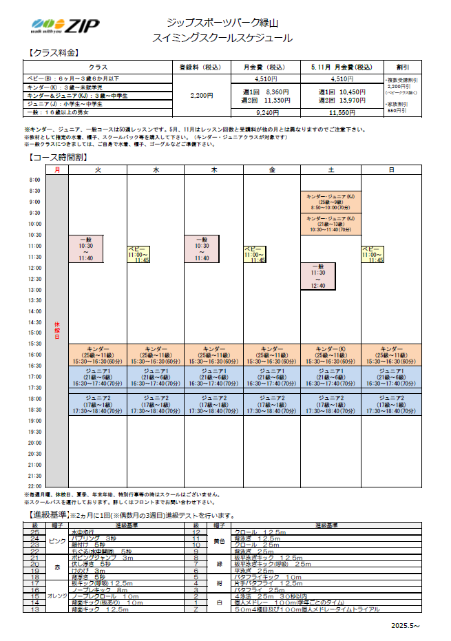 | クラス | 時間 | 受講料 | 受講料 / (5月・11月) |