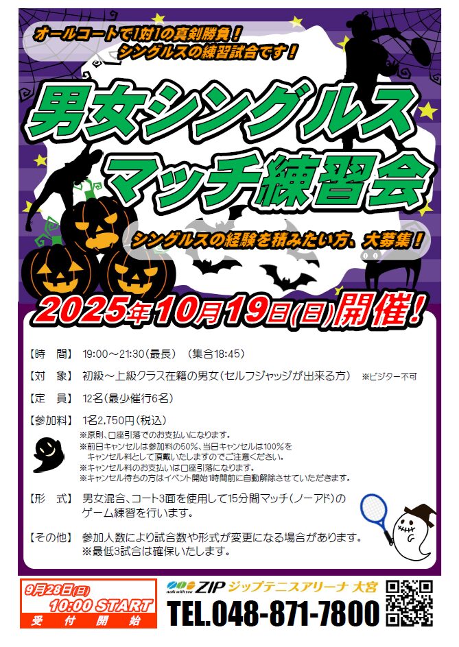 10月19日(日)「男女シングルスマッチ練習会」開催のお知らせ