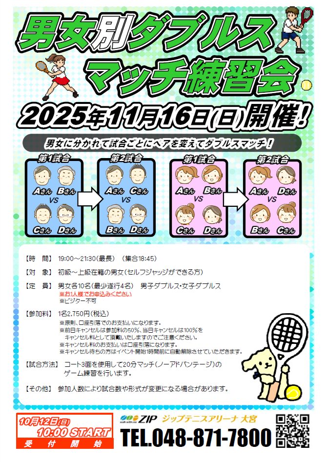 【内容】男女別、ダブルスゲーム形式【時間】19:00~21:30(最長)【対象】一般クラス初級、初中級【定員】男女各10名ずつ【参加料】1名2,750円(税込)その他詳細はPOPをご確認ください。皆様のご参加お待ちしております!!