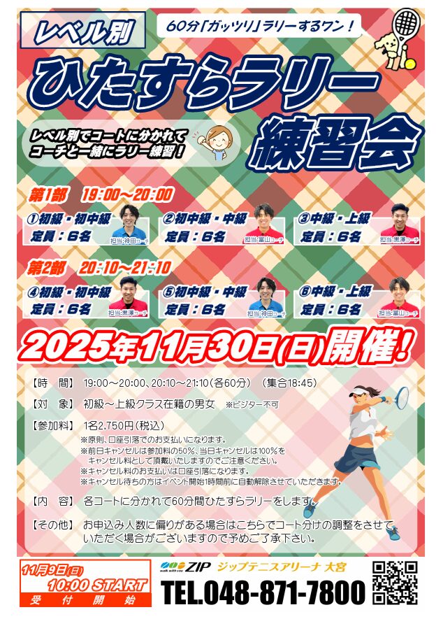 【内容】レベル別でコートに分かれて60分間コーチと一緒に「ひたすら」ラリー練習します!