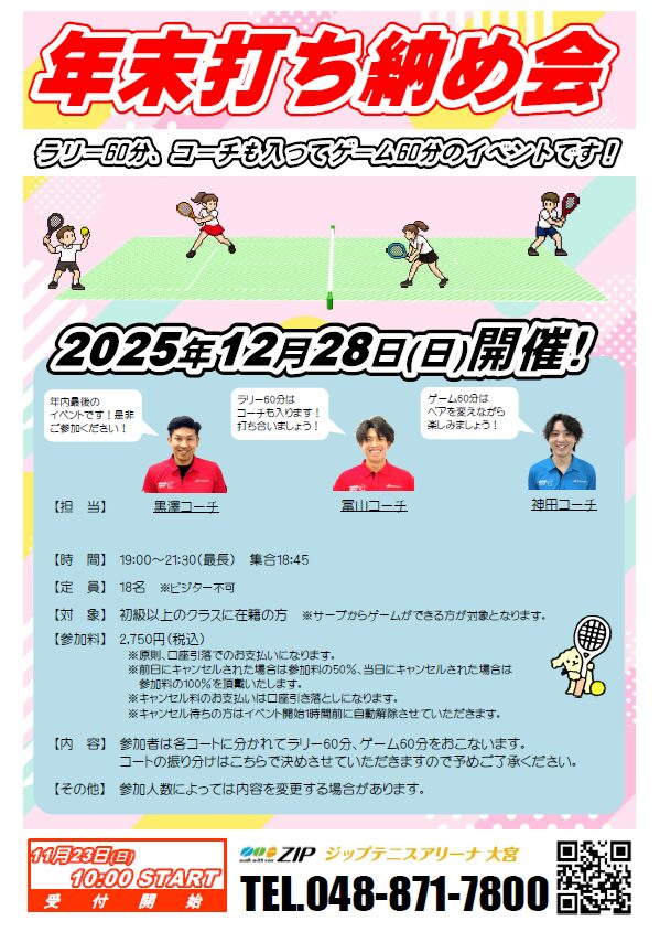 【時間】19:00~21:30(最長)【対象】初級以上のクラスに在籍の方(ビジター不可)【定員】18名 ※ビジター不可【参加料】2,750円(税込)その他詳細はPOPをご確認ください。皆様のご参加お待ちしております!!
