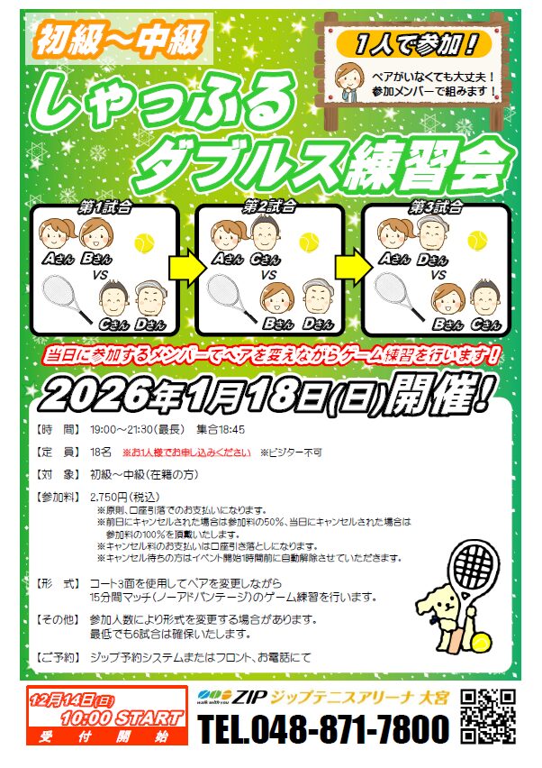 2026年1月18日(日)「初級~中級しゃっふるダブルス練習会」を開催いたします。